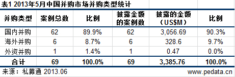 根据清科集团旗下私募通统计,2013年5月中国并购市场共完成69起并购交易,其中披露金额的有69起,交易总金额约为33.86亿美元,平均每起案例资金规模约4,907.00万美元。与上月相比,5月中国市场并购交易总金额增加33.9%;与去年同期相比,下降31.2%,2012年5月共发生16起跨国并购,交易金额约40.00亿美元,已高于本月总交易金额,造成同比较大降幅。