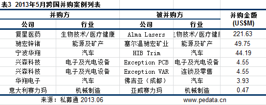 根据私募通统计,2013年5月共完成7起跨国并购,其中海外并购6起,外资并购1起。5月跨国并购共有7起案例披露金额,披露总金额为3.29亿美元。其中,披露交易金额^大的是复星医药收购Alma Lasers。Alma Lasers Ltd.成立于1999 年,是一家总部位于以色列的医疗美容器械生产企业,中国为其^大市场之一。此次交易完成后,复星医药将把Alma Lasers建设成高端医疗器械的研发、制造管理平台,深入探索复星医药的国际化发展路径。