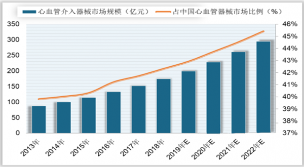 当前,我国心血管介入器械市场持续扩容。2017年,我国心血管介入器械市场规模为152.1亿元,预计2022年将达到294.9亿元,2017-2022年复合增长率为14.2%。